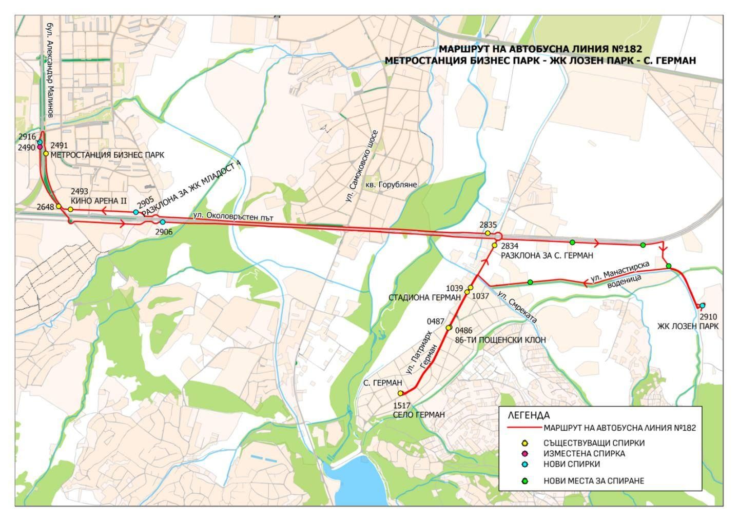 С Решение №171 на СОС от 26.02.2026 година, считано от 15.04.2026 г. стартира автобусна линия №182 със следния маршрут: метростанция “Бизнес парк” - Софийски околовръстен път - ул. “Панорама Лозен” - ж.к. Лозен парк” - ул. “Манастирска воденица” - ул. “Смреката” - ул. “Патриарх Герман” - с. Герман - ул. “Патриарх Герман” - Софийски околовръстен път - метростанция “Бизнес парк”.